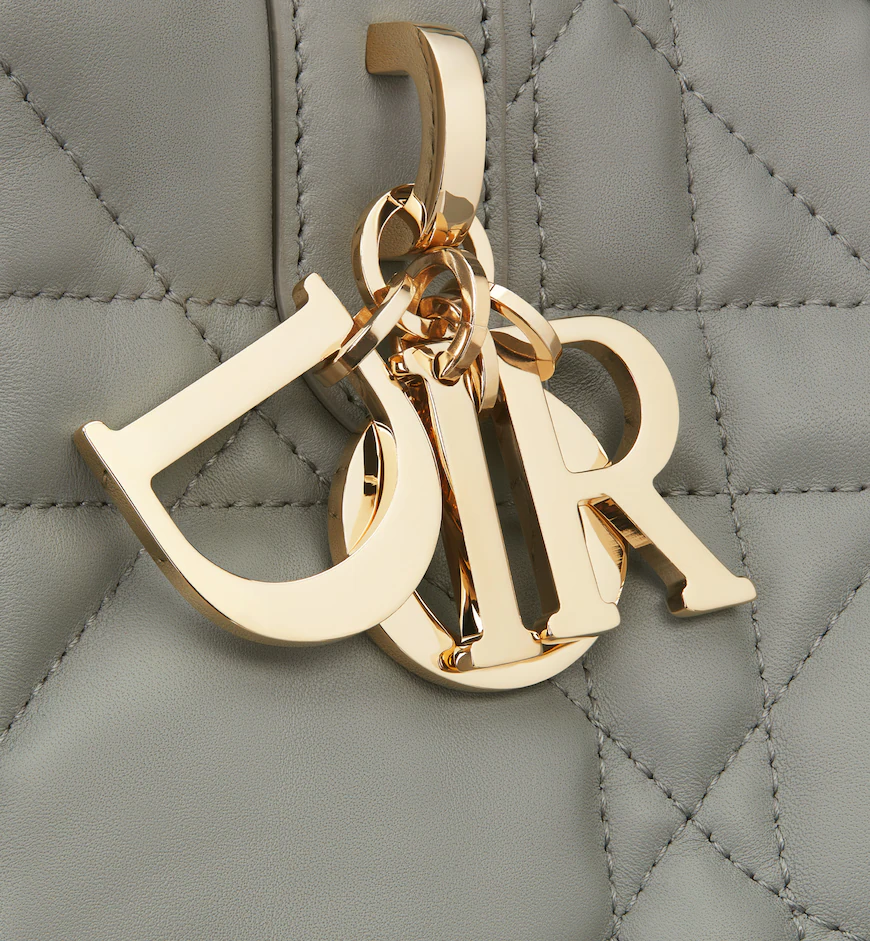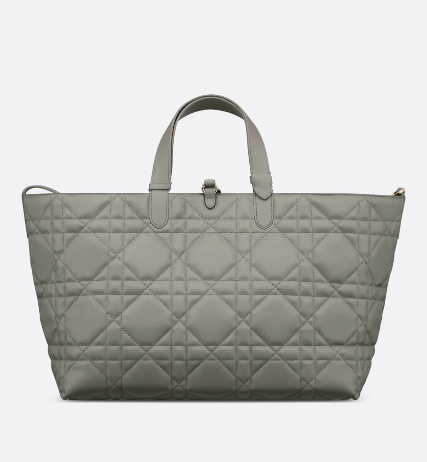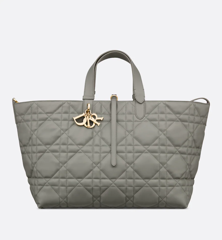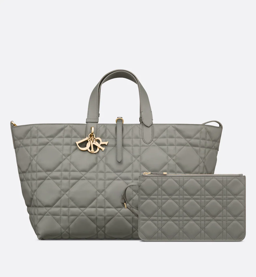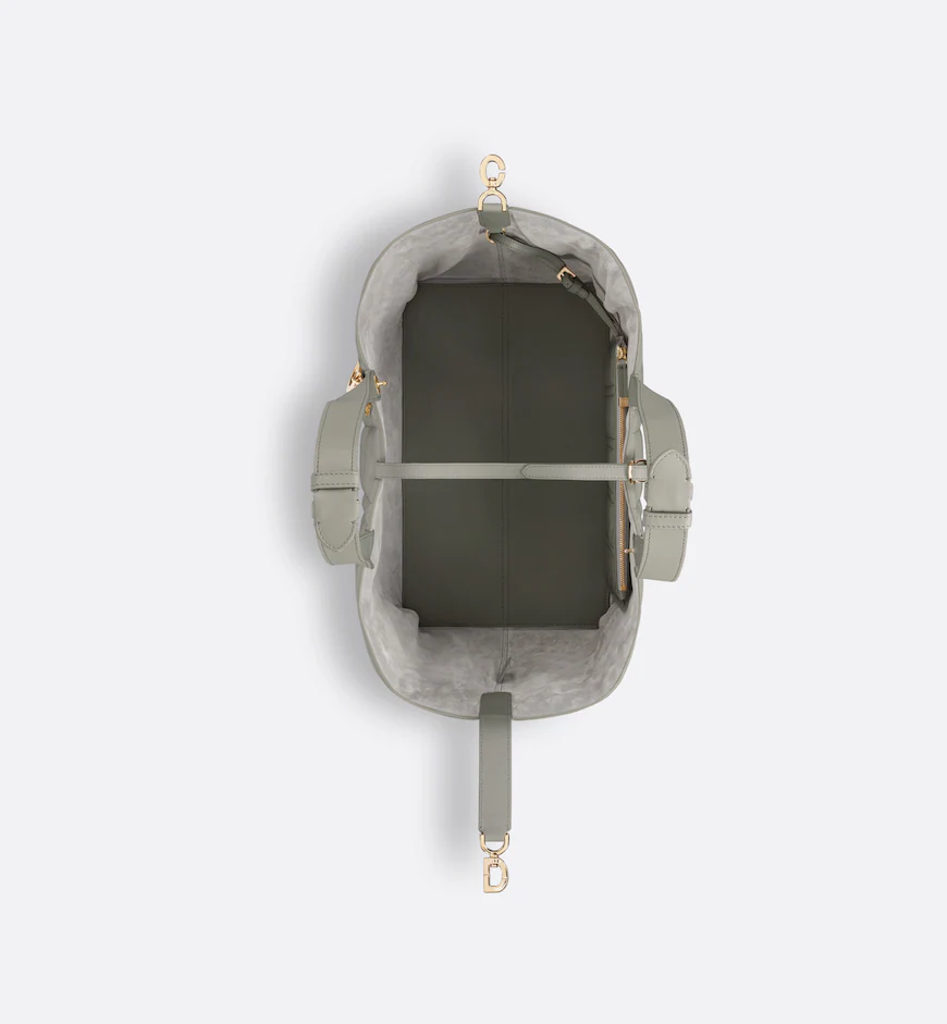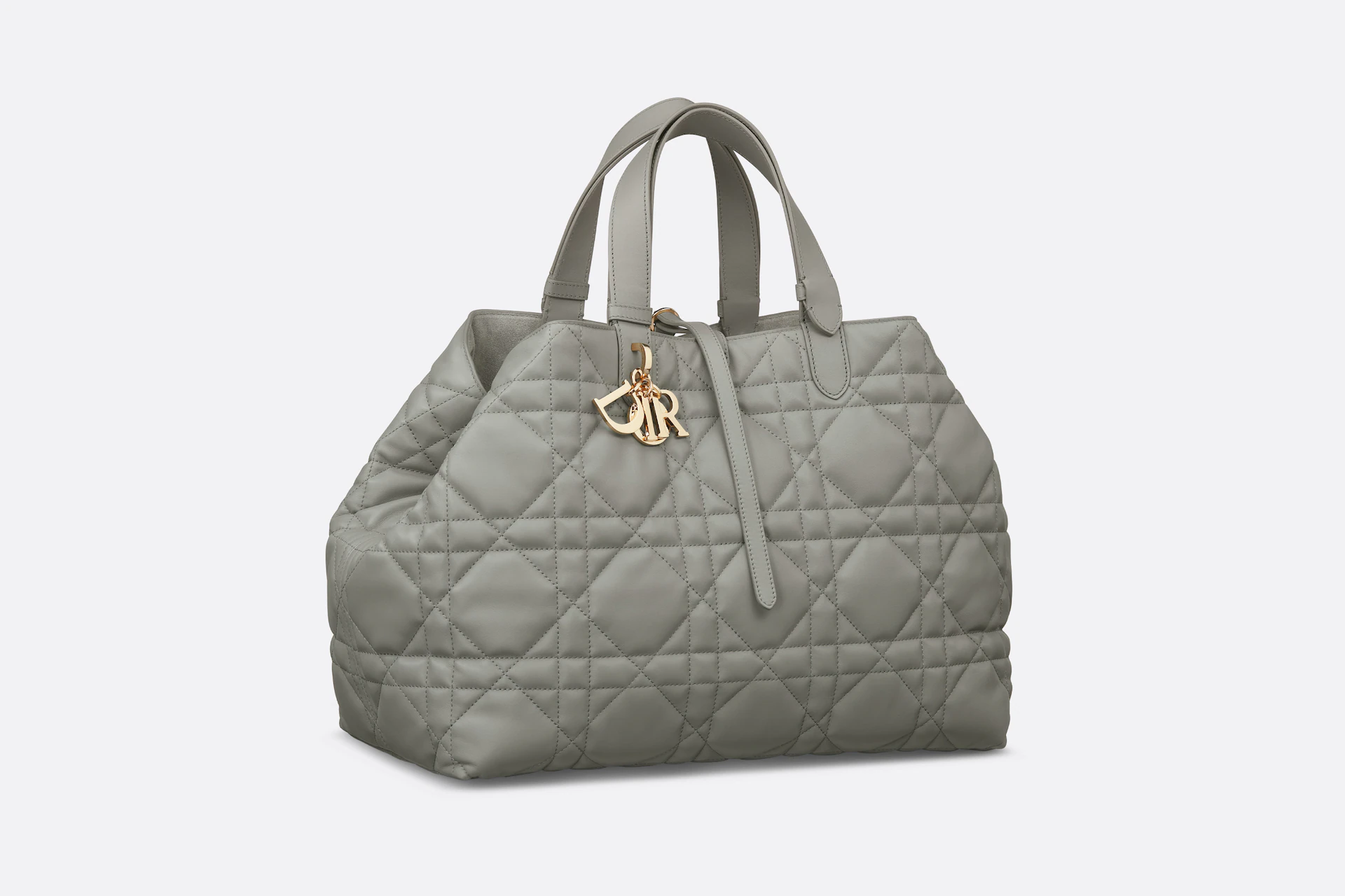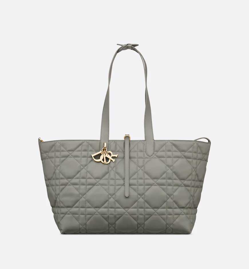 The Dior Toujours bag is distinguished by a casual and practical design. Crafted in stone gray calfskin with Macrocannage topstitching, it showcases a spacious interior compartment with a matching pouch to organize the essentials. Its leather strap closure keeps items secure while the D of the CD Lock closure twists to adjust the sides and enhance the bag’s silhouette. The leather handles can be adjusted using the small notches in order to be able to carry the large bag by hand or wear it over the shoulder.