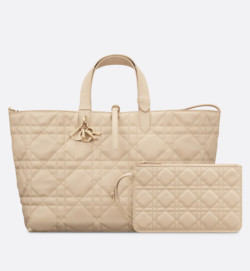 The Dior Toujours bag is distinguished by a casual and practical design. Crafted in powder beige calfskin with Macrocannage topstitching, it showcases a spacious interior compartment with a matching pouch to organize the essentials. Its leather strap closure keeps items secure while the D of the CD Lock closure twists to adjust the sides and enhance the bag’s silhouette. The leather handles can be adjusted using the small notches in order to be able to carry the large bag by hand or wear it over the shoulder.