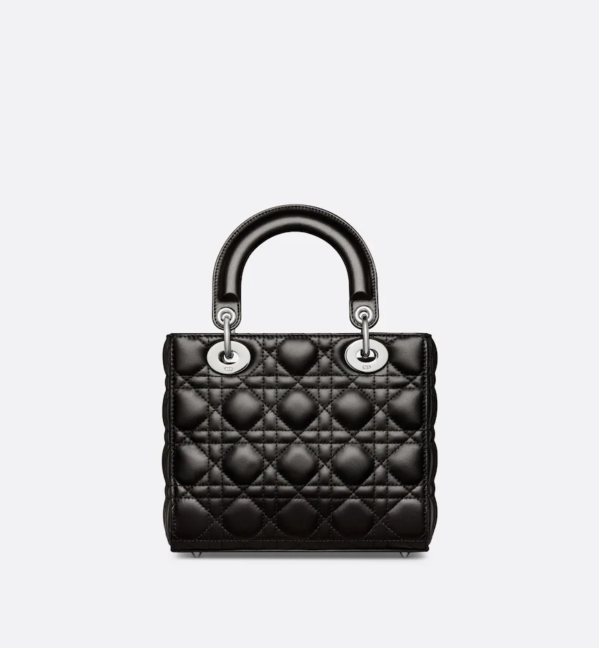 The Lady Dior My ABCDior bag epitomizes Dior’s vision of elegance and beauty. Sleek and refined. the timeless style is crafted in black lambskin with Cannage stitching. creating the instantly recognizable quilted texture. Silver-finish metal D.I.O.R. charms further embellish its silhouette with an elegant touch. Featuring a shoulder strap that can be personalized with badges. the small. unique design may be carried by hand or worn crossbody.