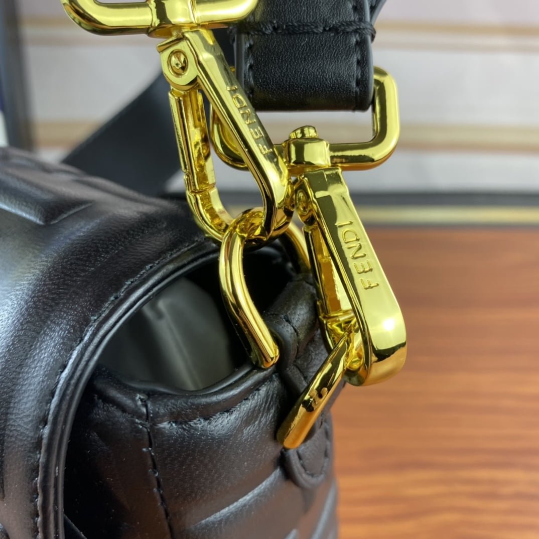 Clamshell magnetic snaps. Equipped with FF magnetic buckle. Lined with zipper bag. With removable shoulder strap, handbag can be shoulder or crossbody. (Sheepskin). Decorated with FF embossed pattern. Gold metal part number F0191