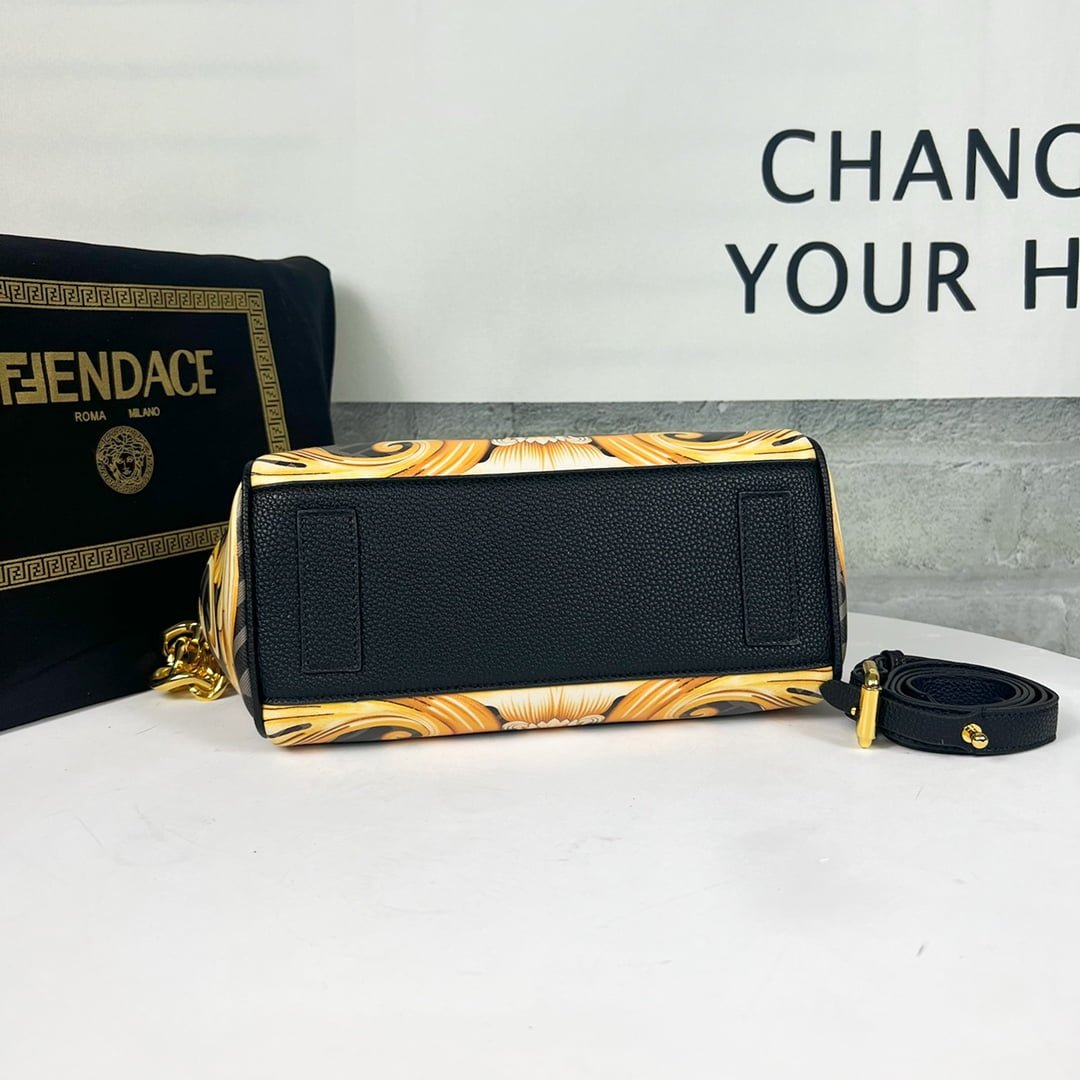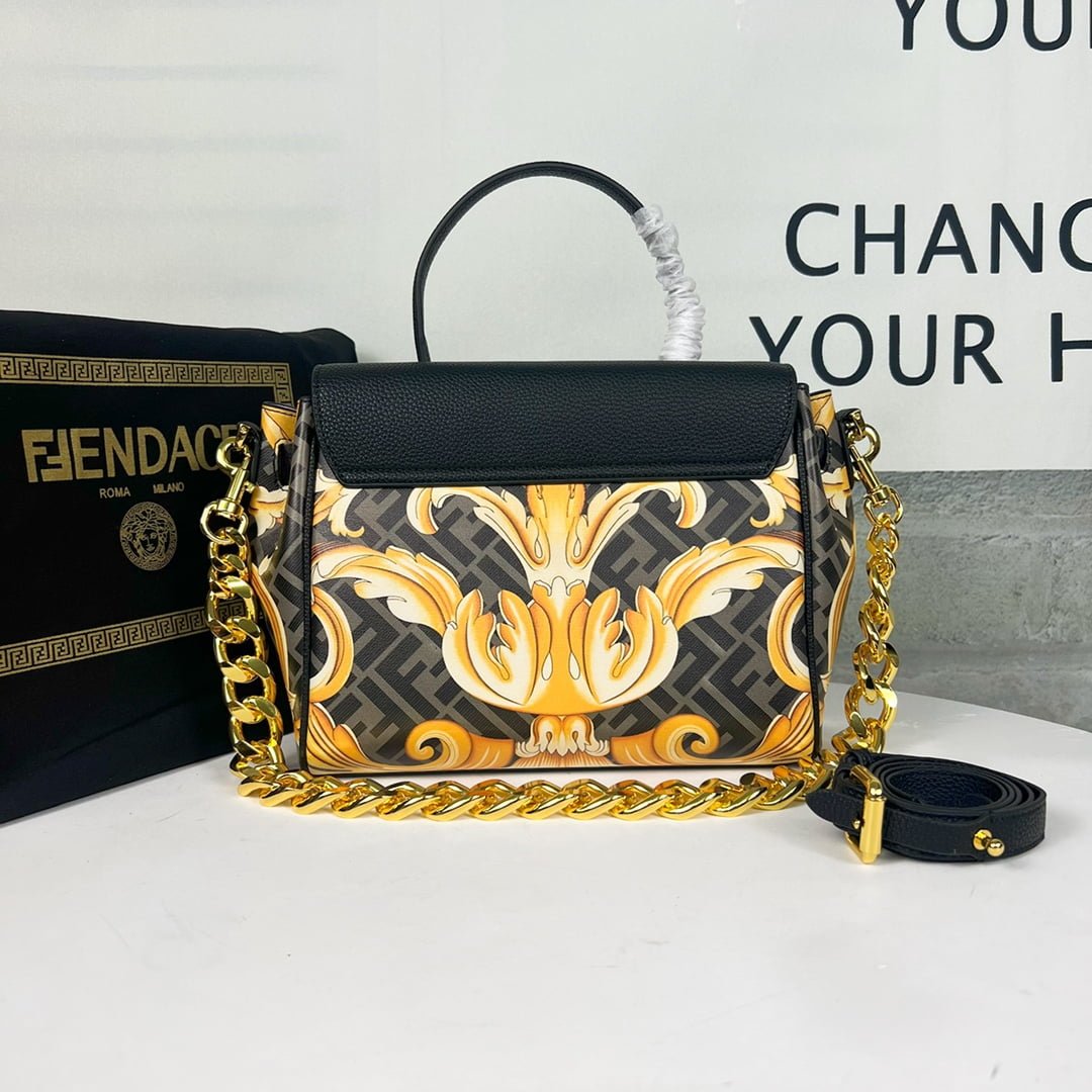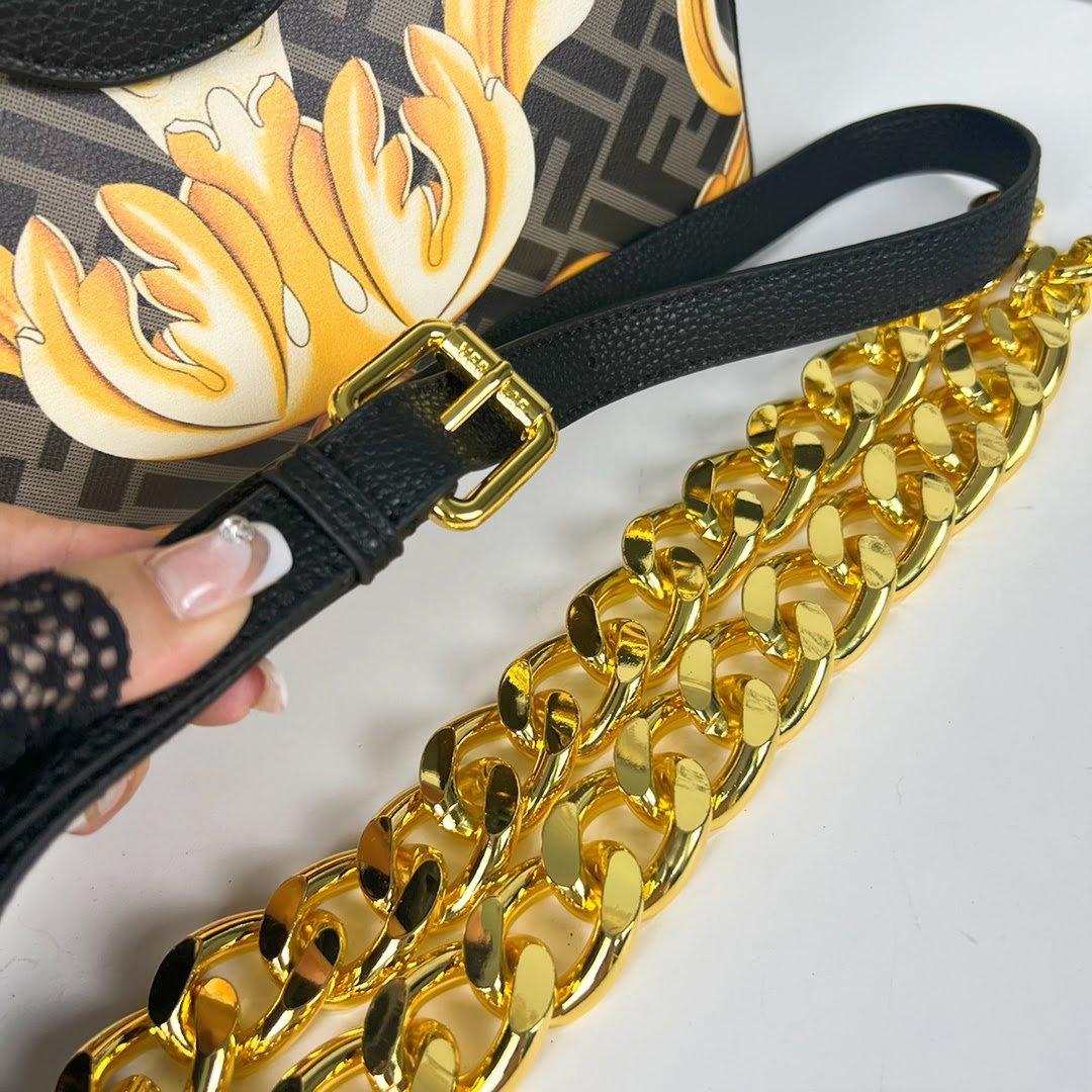 Versace and Fendi Century ????, the Medusa collection, Versace’s signature La Medusa handbag is inspired by the creative exchange between Kim Jones and Donatella Versace, reinvented with Fendace Gold Baroque prints, Decorated with Medusa panels, flap with Fendi hardware accessories, all-in-one clutch can be carried, or can be used to replace the chain and leather shoulder strap crossbody, the capacity is just right, practical, elegant modern fantasy luxury, turn the head 100%
