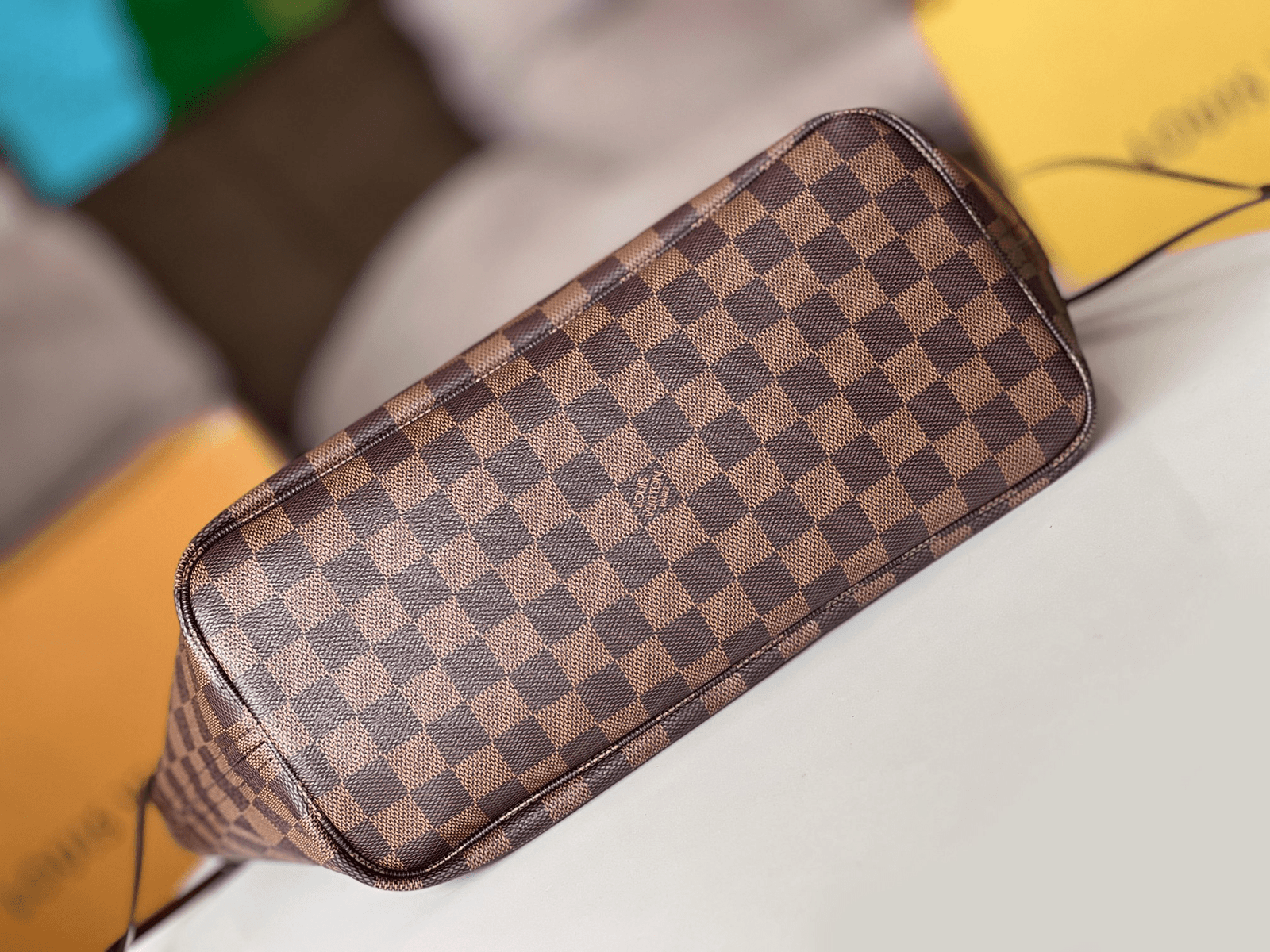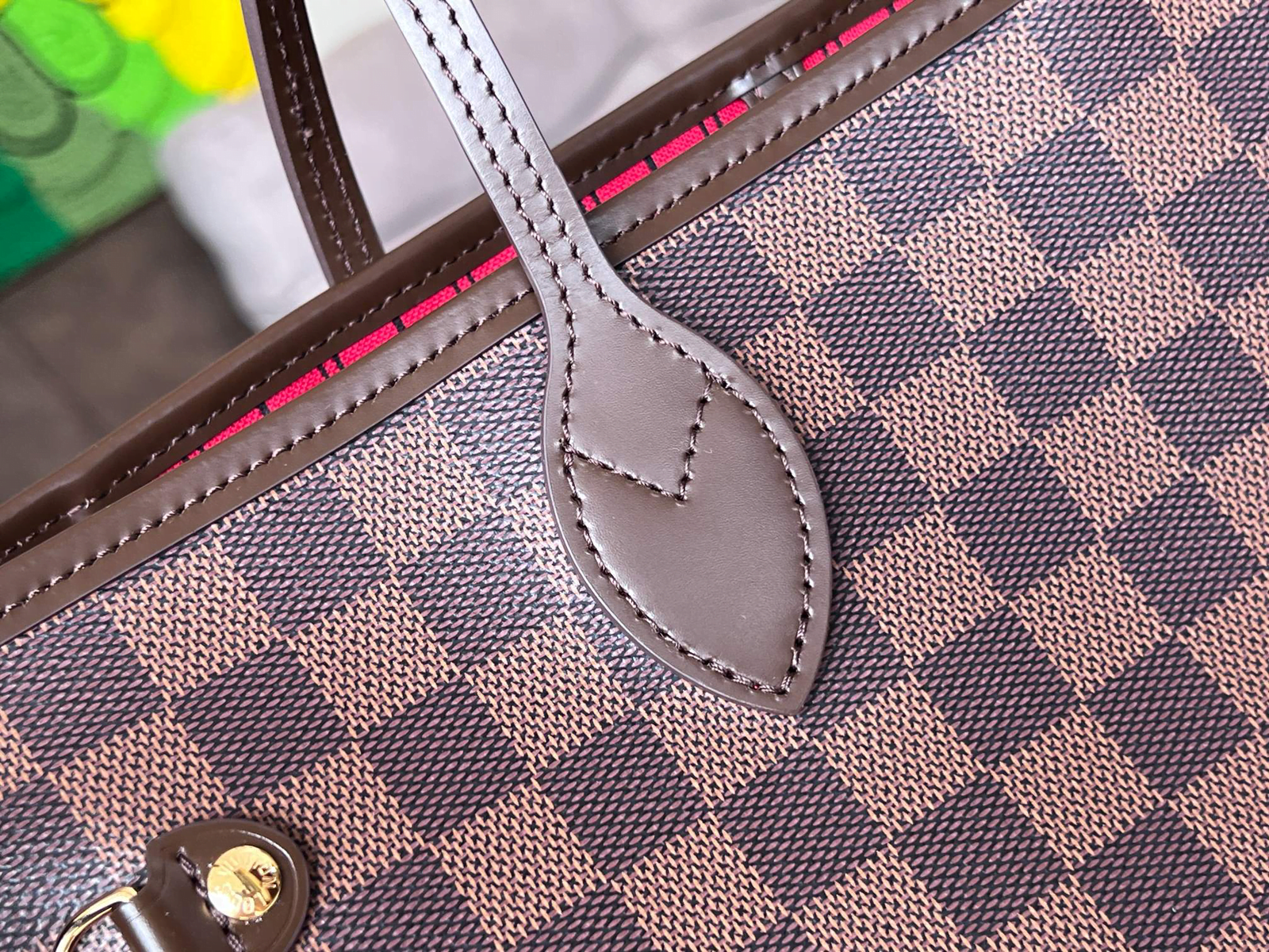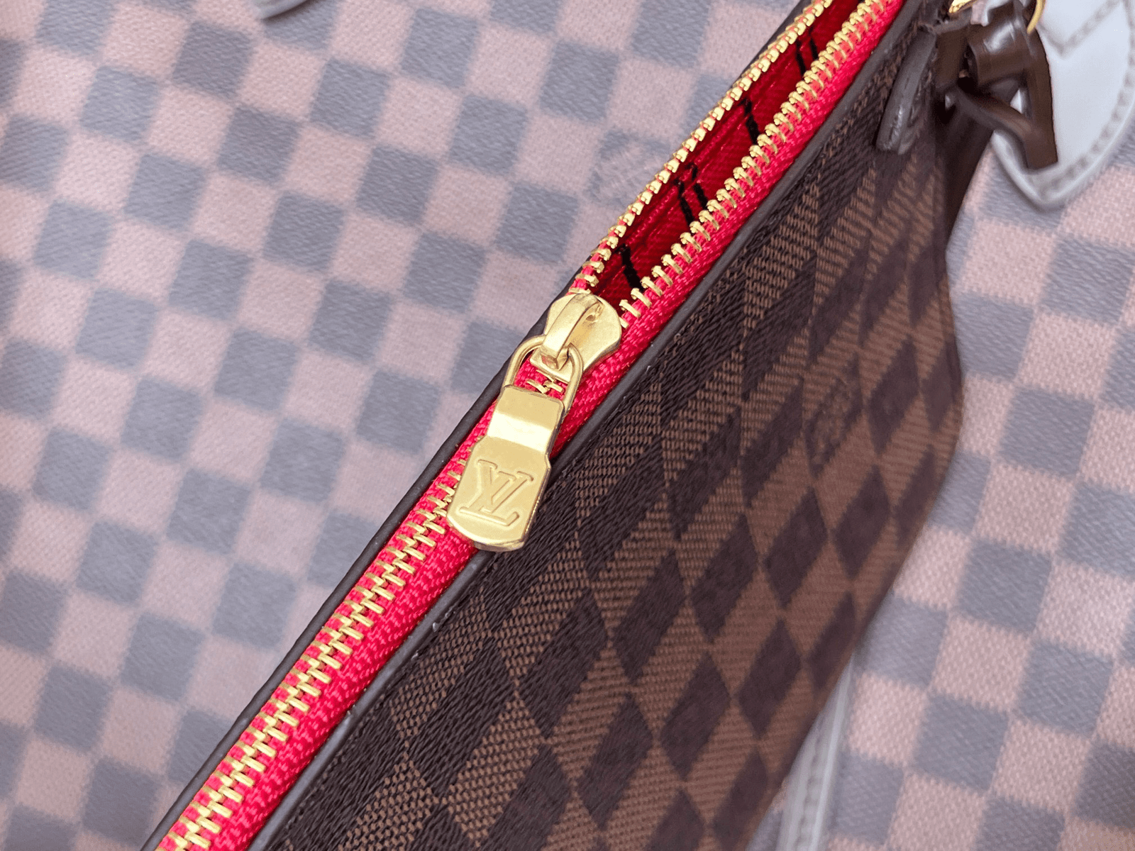 This season’s edition of the beloved Neverfull MM tote features a braided leather strap in tender colors. The trim’s cream and pink tones complement the signature Damier Ebene canvas. a pattern created in 1888 by Georges Vuitton. A versatile carryall. the bag can be either cinched closed with the side laces or left open for a more casual allure.