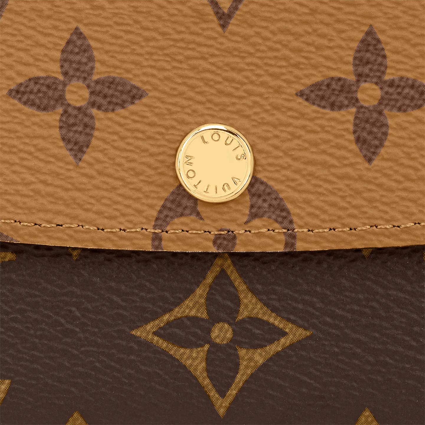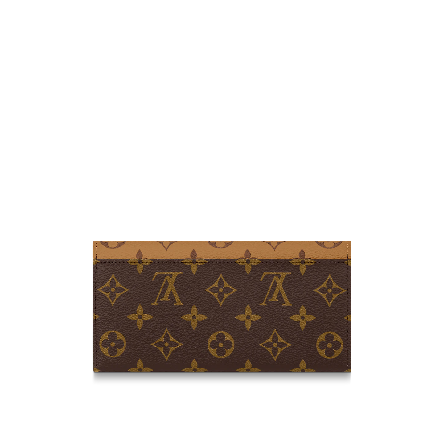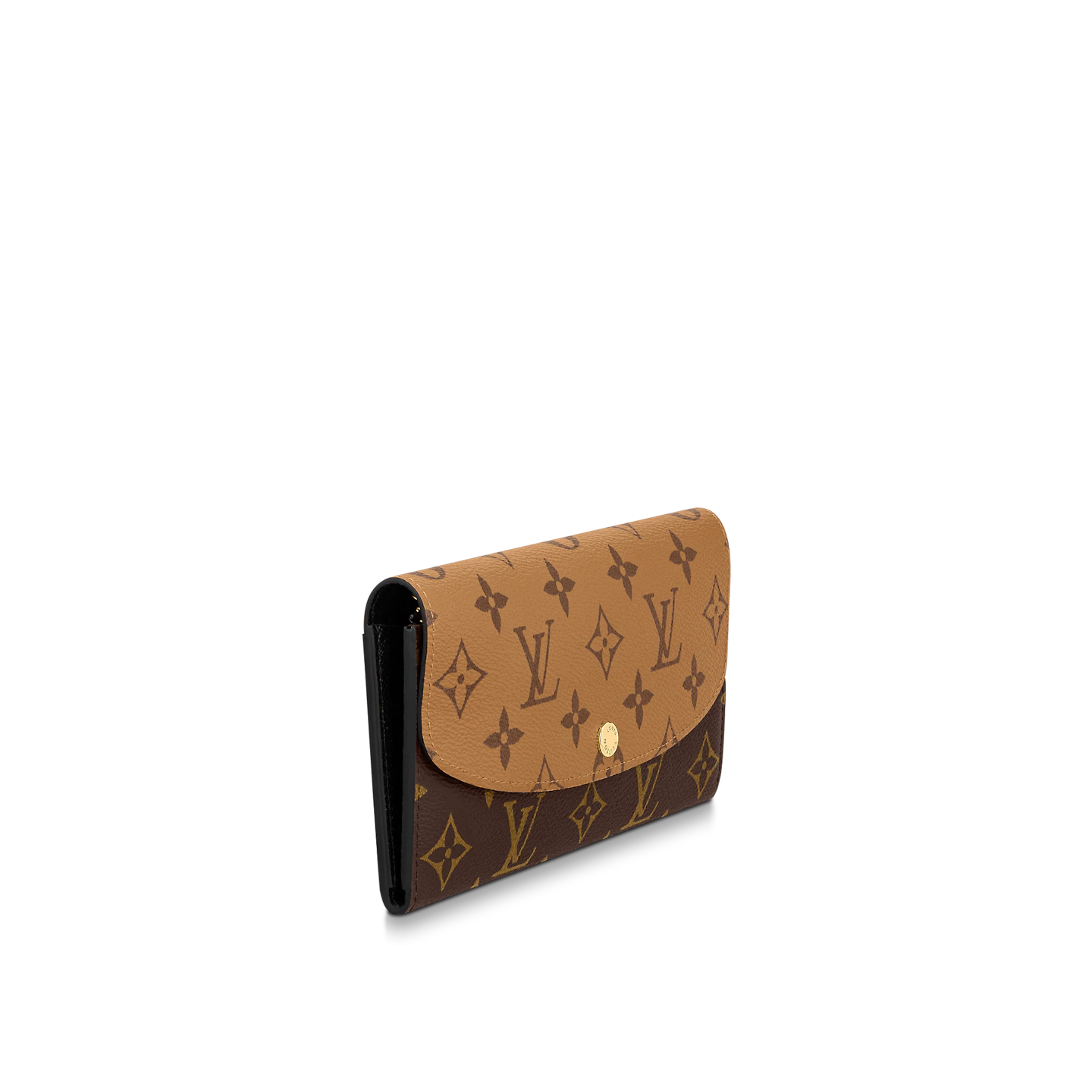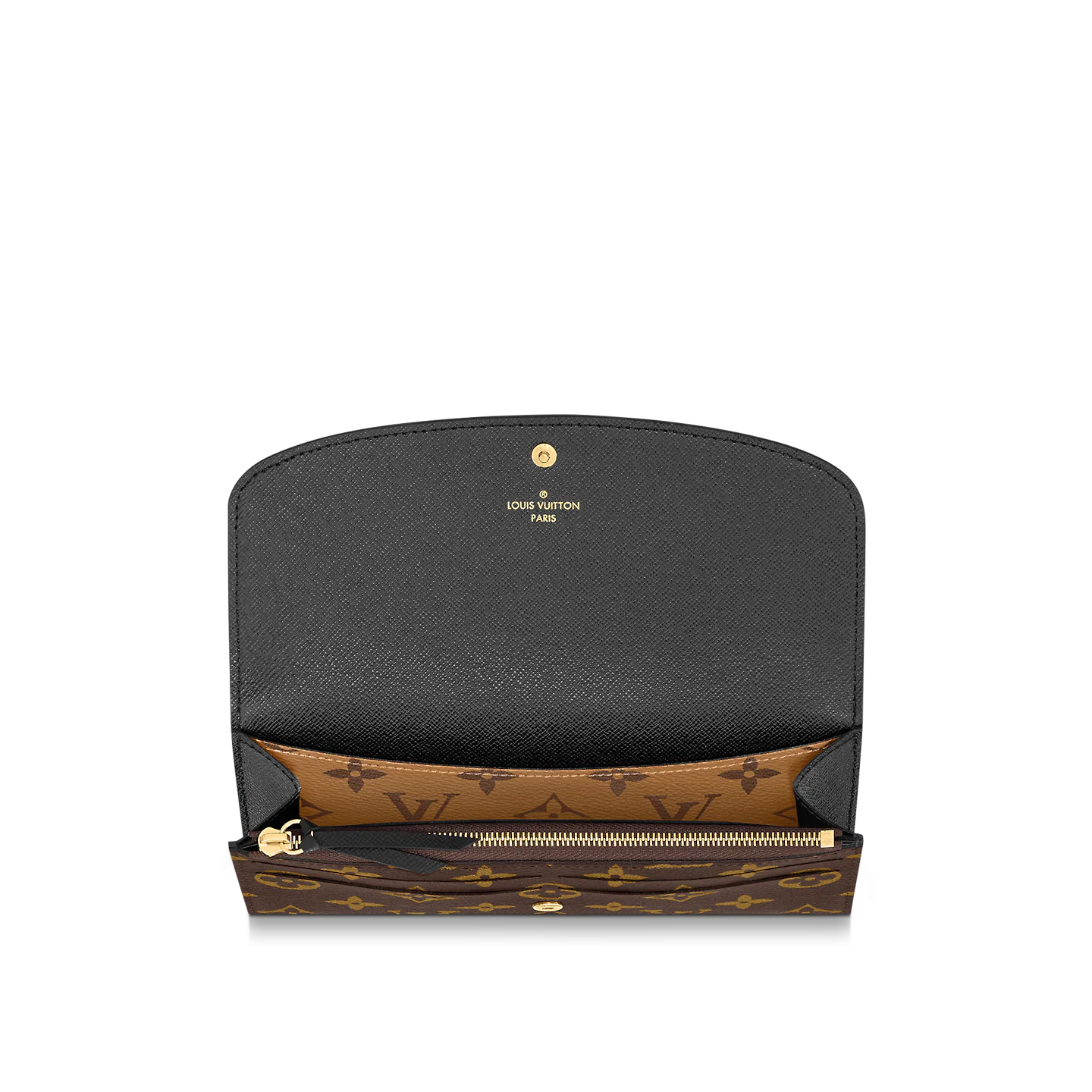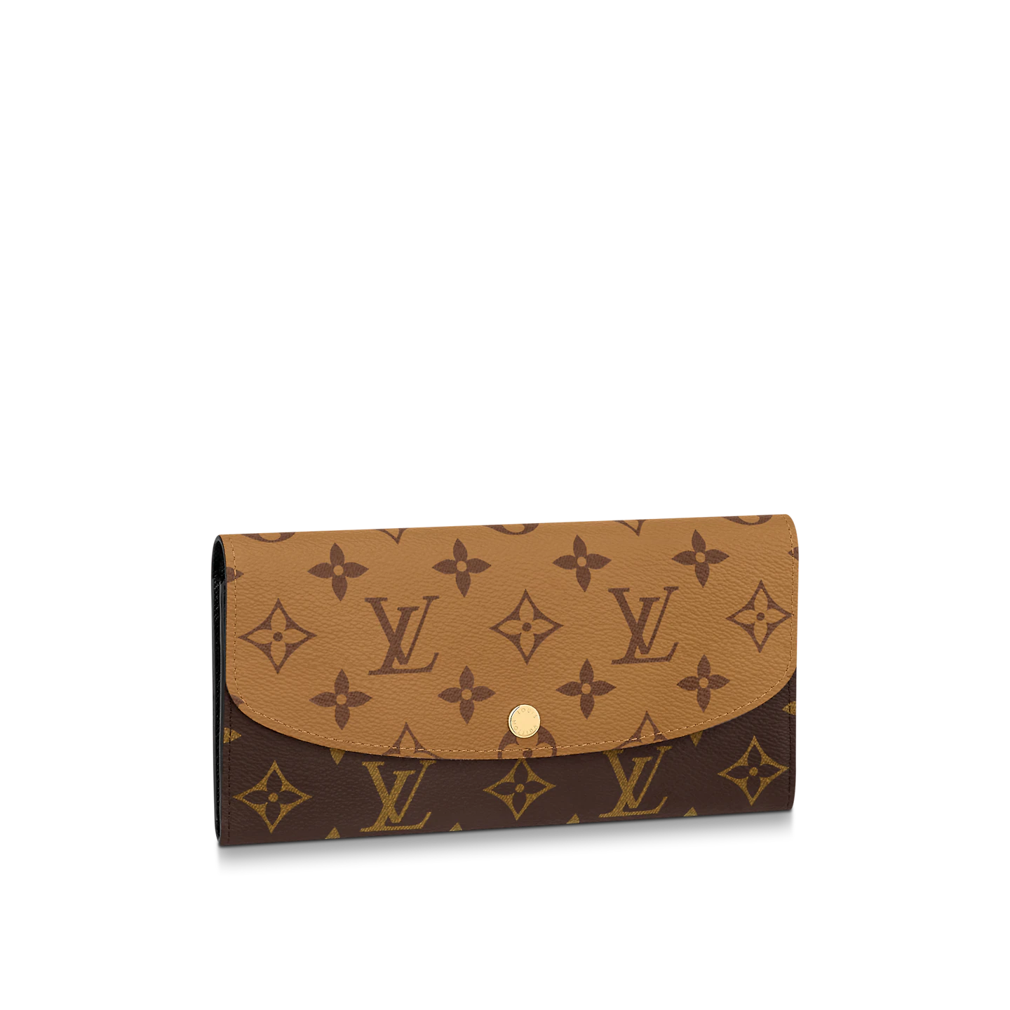 This edition of the Emilie wallet combines Monogram and Monogram Reverse canvas for a sophisticated. modern look. Distinguished by its sleek design and rounded flap. this wallet slips easily into most bags. and can even double as a clutch. Its neat interior offers many practical features. while there is an additional flat pocket at the back.
