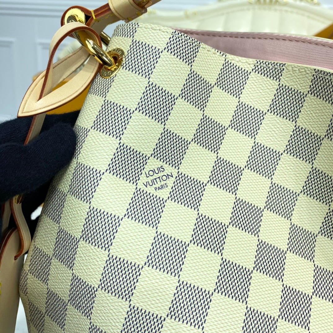 The Neverfull GM tote unites timeless design with heritage details. Crafted from fresh Damier Azur canvas with natural cowhide trim.