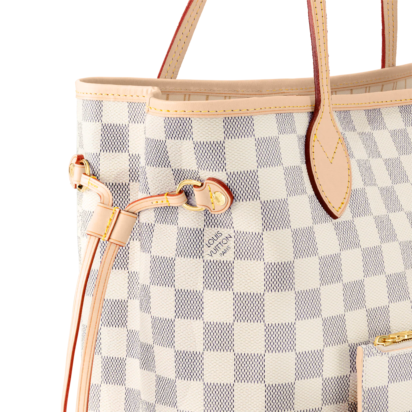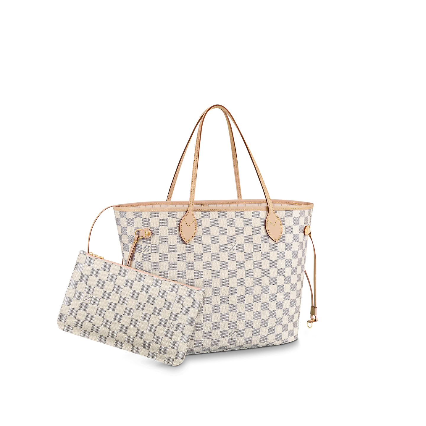 The Neverfull MM tote unites timeless design with heritage details. Made from fresh Damier Azur canvas with natural cowhide trim. it is roomy yet not bulky. with side laces that cinch for a sleek allure or loosen for a casual look. The slim leather handles slip easily over the shoulder or arm. Lined in colorful textile. it features a removable pouch which can be used as a clutch or an extra pocket.