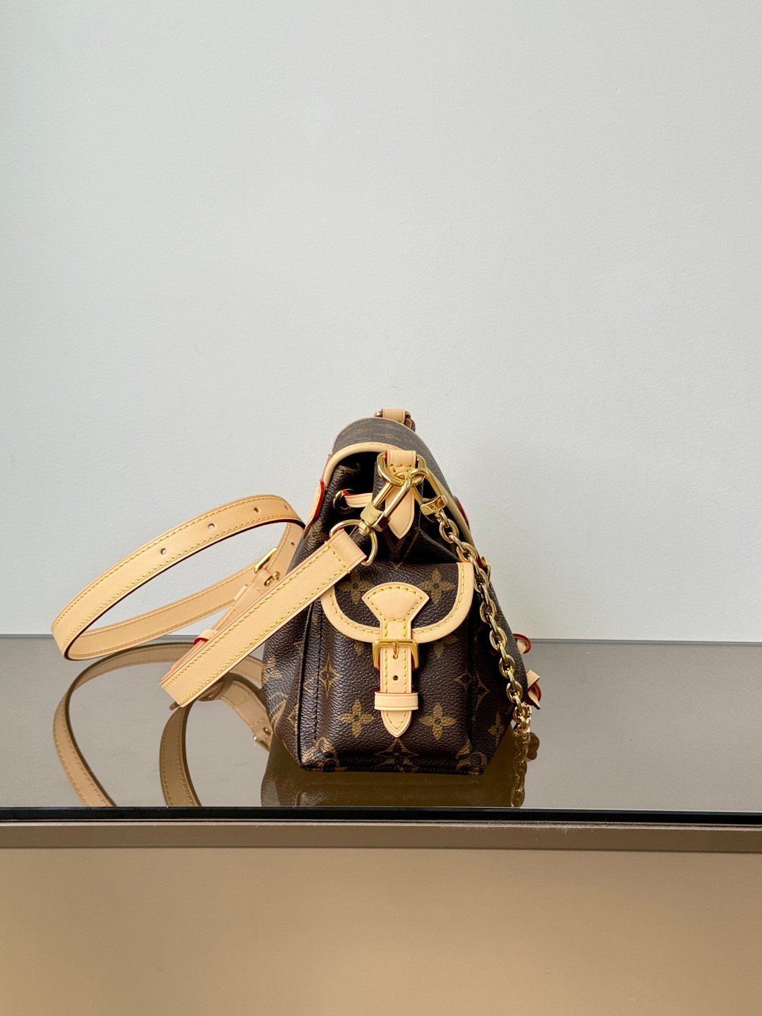 Introducing the Odyssée handbag from the Pre-Fall 2025 collection, designed in tribute to the House’s heritage. This chic everyday design is crafted from signature Monogram canvas, elevated with gold-toned buckles and a removable decorative chain. The side pockets provide easy access to smaller essentials, such as a set of keys and a lipstick.