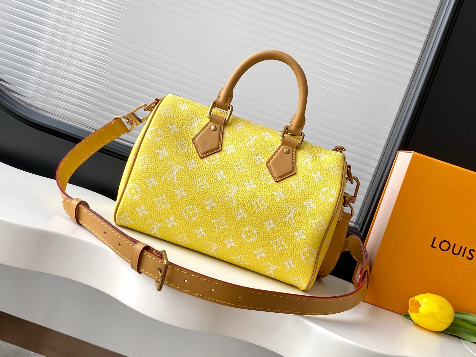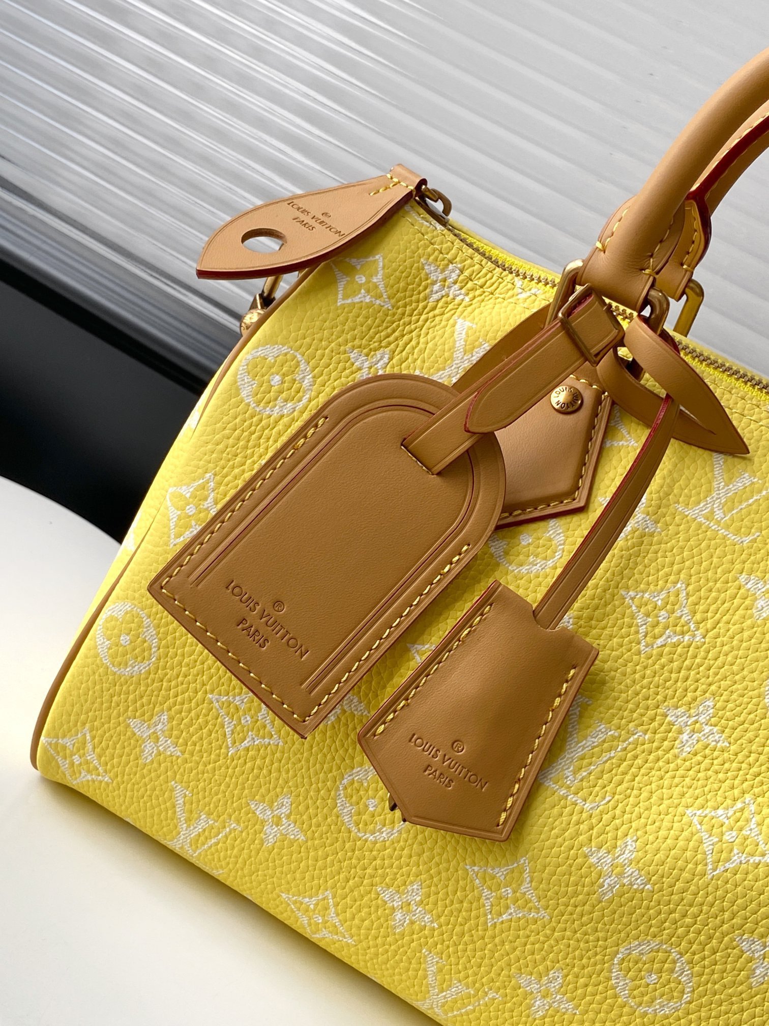 The Speedy P9 Bandoulière 25 is made from calf leather made from acid colours, with a sunbleach effect. An ideal everyday bag, the Speedy P9 comes with a removable leather pouch inside and is lined in luxurious lambskin. The two top handles and removable and adjustable shoulder strap give carry options.